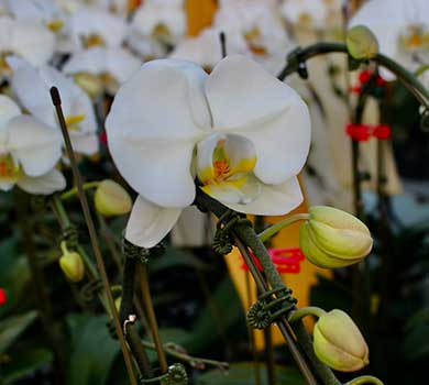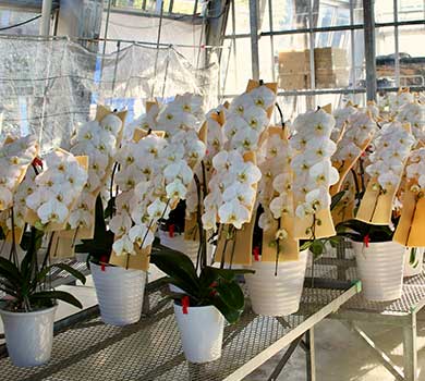 胡蝶蘭は、その育成において発芽から開花までの繊細な作業工程を踏まなければなりません。温度管理や湿度管理を徹底し、150日ほどの時間をかけた中で、初めて皆様がイメージする花に育つのです。弊社スタッフは、一人ひとりがその作業に誠心誠意取り組み、愛情を込めて育成し、そして見事な姿になった胡蝶蘭を誇りをもってお客様にお届けします。